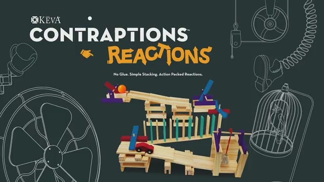 KEVA Contraptions Reactions contains 178 wooden planks, 8 dowels, 2 reaction balls, 1 bell, 1 string, 1 bowling pin, 1 toy car and a 16-page idea book with project photos and quick-start instructions.